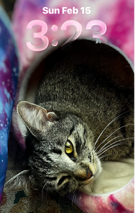 I bought Mr. Poutou sardines in water (no salt) and he really seems to enjoy them. He also gets a little Sheba brand cat food but no dry food. Wookie likes to sleep on my hair at night, it’s like having a big fuzzy Russian fur cap on my head. The cats were cuddle puddle sleeping with me this week.